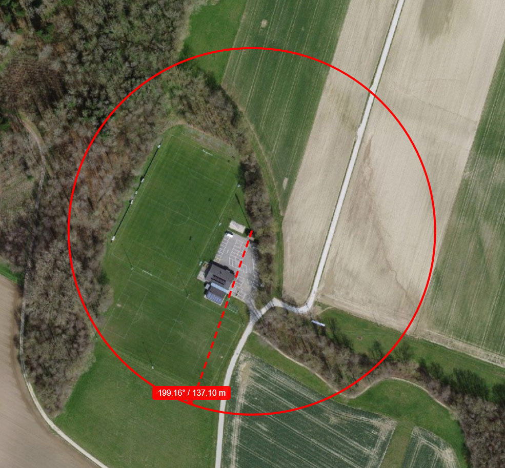 Il existe une situation préoccupante ici, puisque dans une zone de 137 m autour de l'antenne se trouvent deux terrains de football. Mon cercle sur la carte de Swisstopo. Les jeunes qui font du sport sur les terrains seront exposés à un rayonnement extrêmement significatif. La limite préventive pour eux, en tant que personnes sensibles (vulnérables) devrait être au plus de 0,02 V/m. Or le rayonnement sur les terrains vaut en moyenne 10 V/m.